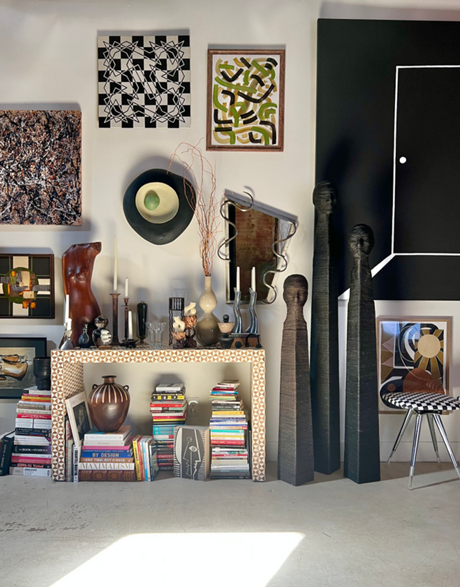 This office renovation was inspired by the client's home country, Brazil. We incorporated bright, colorful patterns, lush plants, and wood textures. The gallery wall was built from the client's collection, from their own paintings to images of Orishas, intended to make the office feel like a home away from home.